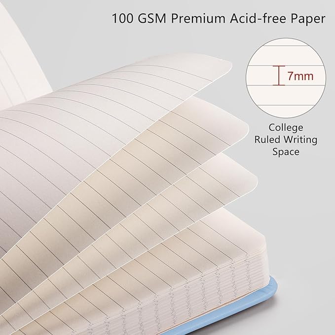 - LINED JOURNAL NOTEBOOK: RETTACY Lined Journal Notebook comes in a A5 size (5.7'' x 8.3''), 192 numbered pages, 7 mm college ruled, durable and smooth leather hardcover, 100 GSM thick acid-free paper, 180° lay-flat, pen holder, elastic closure band, 2 ribbon bookmarks, inner pocket & sticky notes