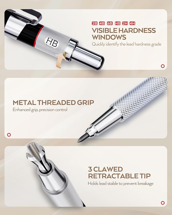 - Ergonomic, Comfortable Design :The full-metal body provides ideal weight balance for fatigue-free writing and drawing or sketching, It brings you more effective and high quality tasks. The lead advances easily at the touch of a click. There is a sharpener in the cap of 2.0 mm mechanical pencil.