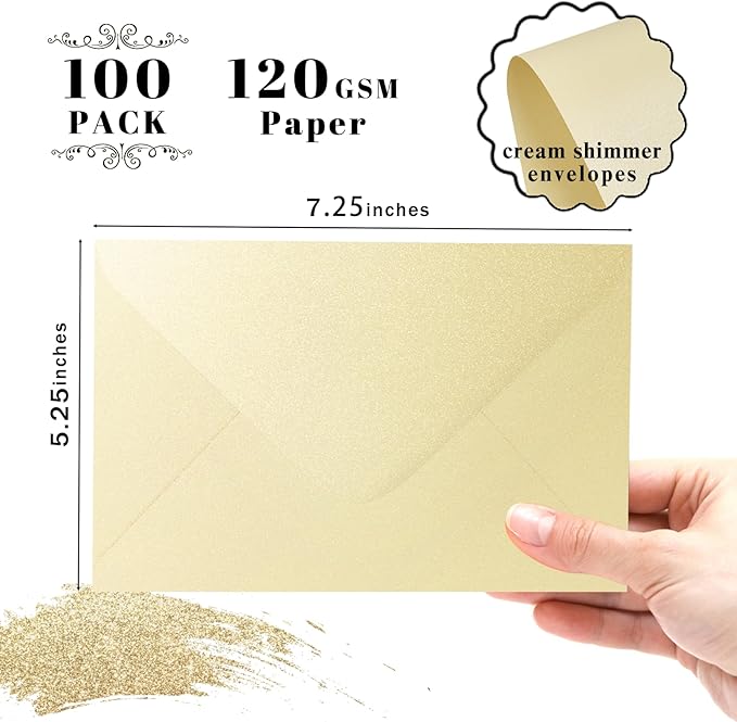 Shimmer Cream Envelopes 5.25 x 7.25 inches 100 PCS, Goefun A7 Euro Flap Envelopes with Gummed Seal for 5 x 7 Cards, Anniversaries, RSVP Invite, Wedding