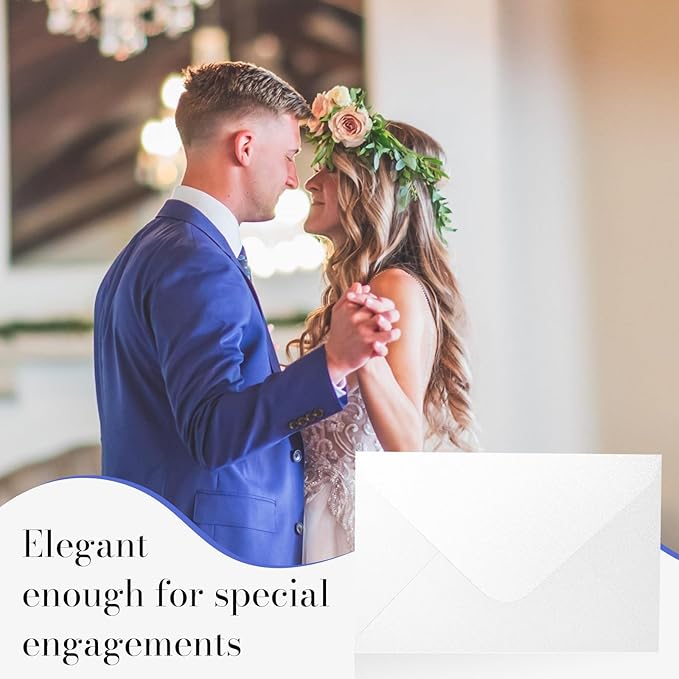 - White Glittery Envelopes: White shimmering glossy paper, best seen in lighted conditions, combined with the V-shaped flap envelope design, giving a more beautiful and texture look than ordinary envelopes. Due to the ray, camera, monitor, people's feeling, etc, the color of the picture may be slightly different from the real color