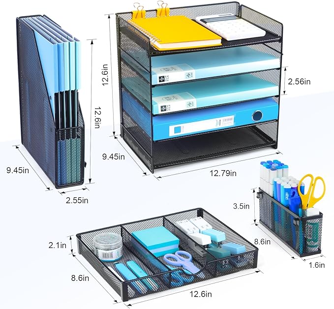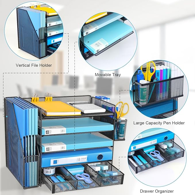 - 【Multiple Use Desk Organizer】Mesh desk organizer with 5 stackable trays, 1 drawer, 1 hanging pen holder and 1 vertical file holder. The desk file organizer will keep your office school desk organized.