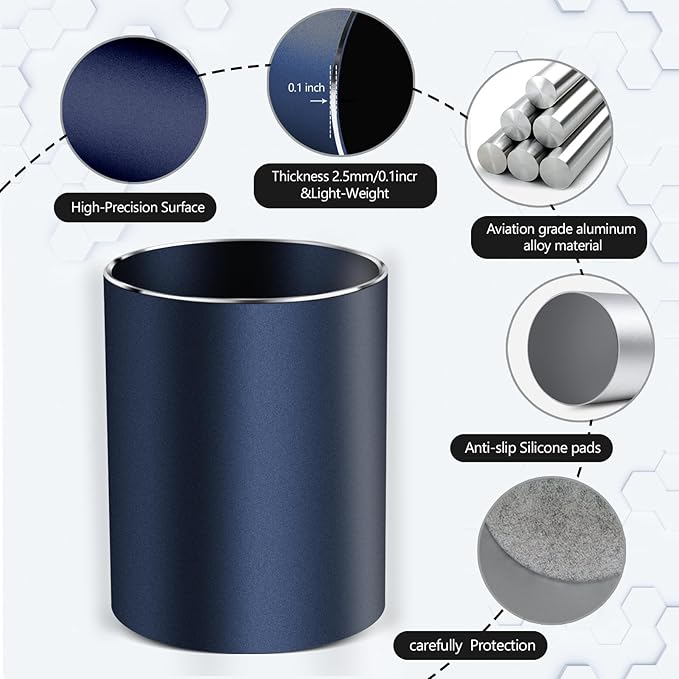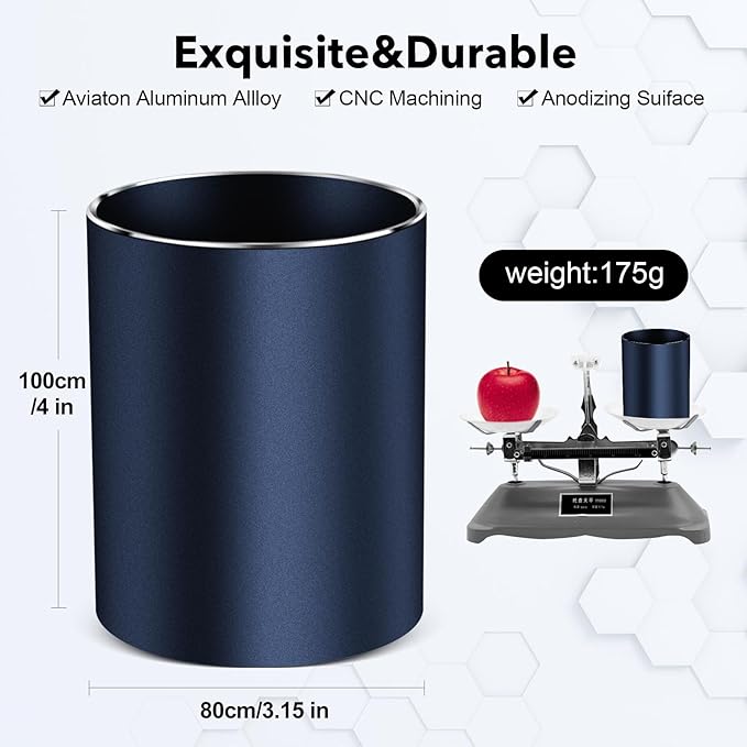 - 【Pen Holder Material】This Pen Pencil holder made is finely crafted from durable aluminum alloy, Beautiful appearance, is durable, not easy to break, and is not easy to rust and mold. solid and very sturdy. the net weight of the aluminum alloy pen holder is only 0.20kg, Unlike other plastic/acrylic pen cup holders on the market, our metal pencil holder is not easy to break and has a longer lifespan to use.