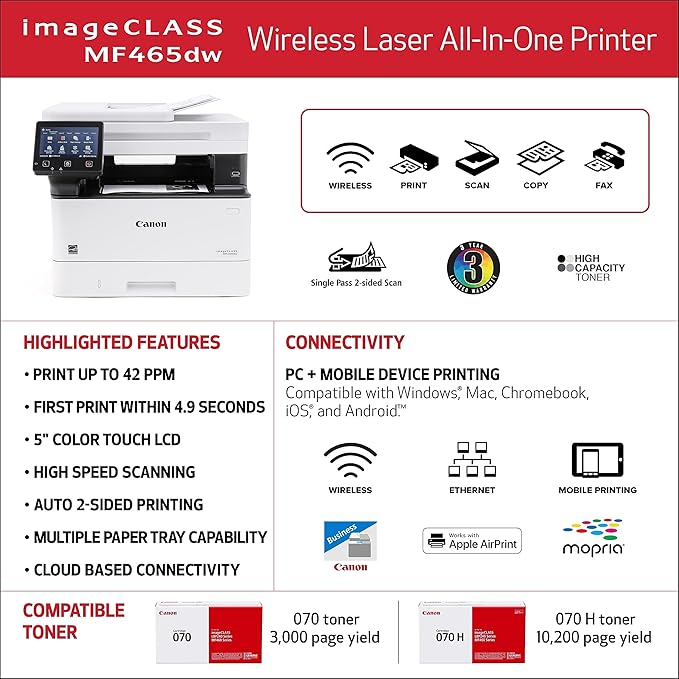 Canon imageCLASS MF465dw - Monochrome, Duplex Wireless Laser Printer, All-in-One with Scanner, Copier, Fax, Home or Office, Auto Document Feeder, Mobile Ready, 3 Year Limited Warranty, 42 PPM, White