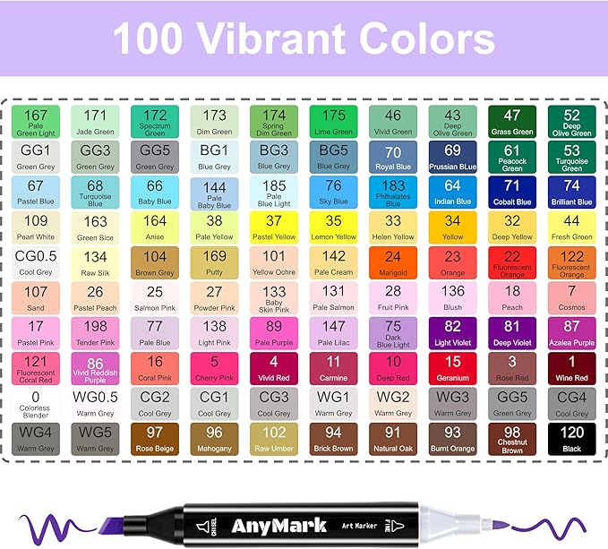 - VIBRANT COLORS: AnyMark 100 colors alcohol markers bring your art to life,are recognized for their excellent coverage, blending ability, and diversity of colors. Unleash your inner artist with our premium markers today!