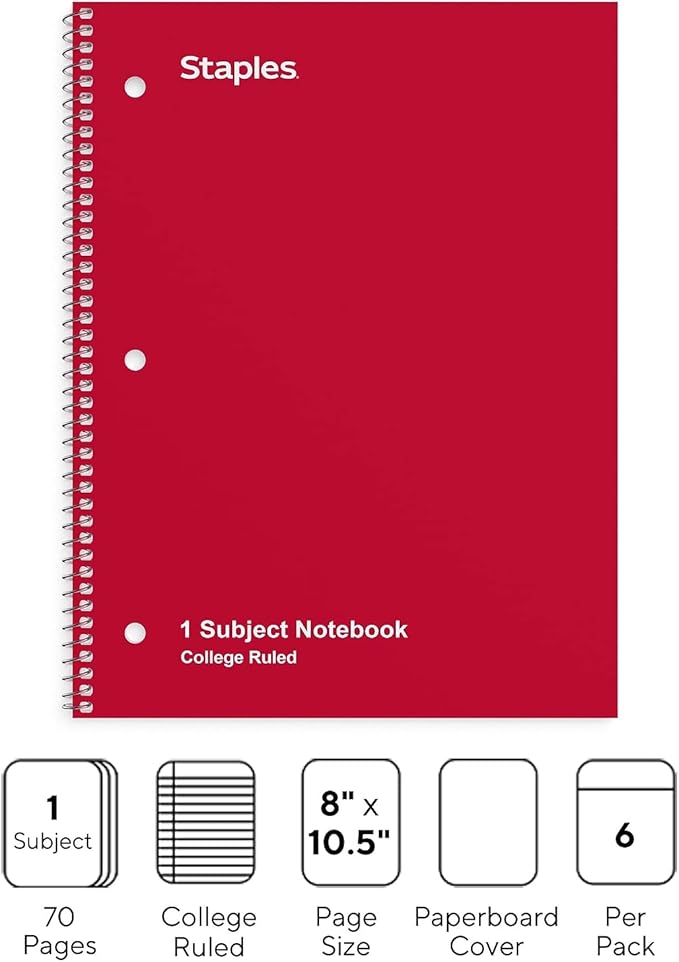 Staples Spiral Notebooks, 1-Subject College Ruled Paper, 8 x 10.5 Inch, 70-Sheets, 6-Pack, Assorted Colors