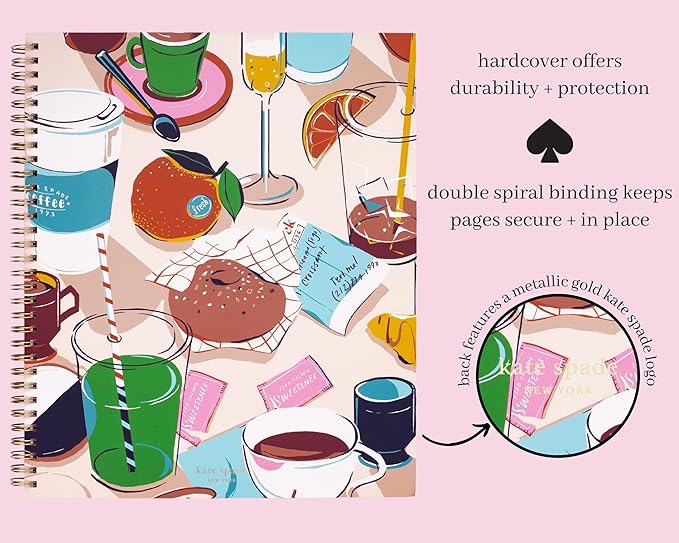 - Hardcover notebook is featured in a fun café inspired pattern with the kate spade new york logo printed on the front cover