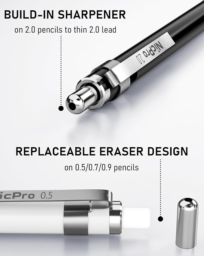 - 2. Good Weight & Smooth Writing: The metal pencil are full-metal body provides nice weight balance for fatigue-free writing and drawing. There is a pencil sharpener inside the cap of the 2.0mm mechanical pencil and 2pcs extra lead sharpeners are provided, you can easily sharpen the pencil lead when it becomes dull and difficult to write. Ideals for artists, professionals, teachers and students alike.
