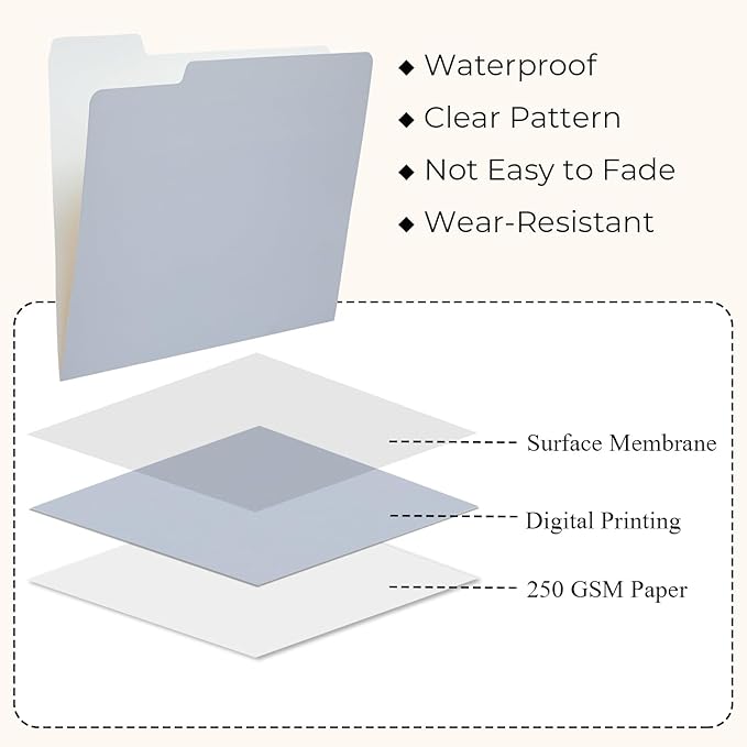 - Heavyweight Material - Decorative file folders are made of 300 GSM recycled paper. Surface membrane technology makes the digital printing pattern of pretty file folders not easy to fade, waterproof, and more wear-resistant
