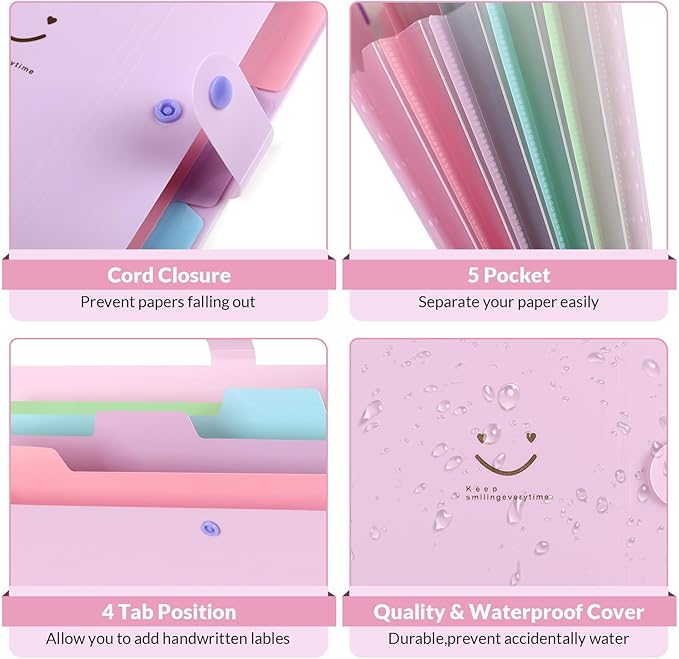 SKYDUE Expanding File Folder with 5 Pockets, Cute Accordion File Organizer, Letter Size Filing Folder, Portable Paper Receipt Organizer, School Office Supplies Purple