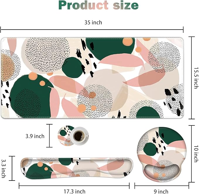 - 【4-in-1 Mouse Pad Set】Ergonomic mouse pad includes desk pad (35x15.5inch), keyboard wrist rest(17.3x3.3inch), mouse pad wrist rest(9x10inch), cup coaster(3.9x3.9inch).No need to buy separately, at a super cost-effective price. This desk pad for keyboard and mouse, is large enough to fit your mouse, gaming keyboard, and other desk items. Keep a clean, uncluttered desk. This helps to improve the gaming experience or work efficiency in the office.