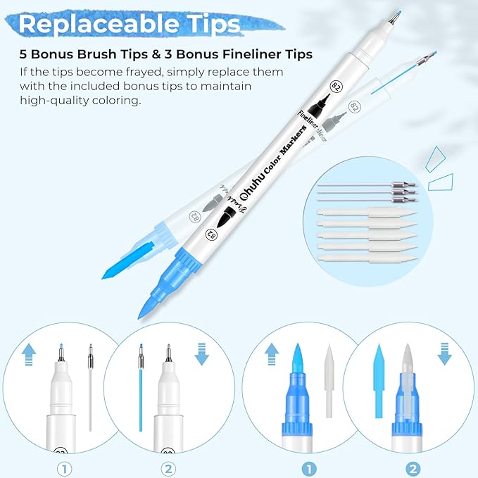 - INCLUDES 8 REPLACEMENT TIPS: Each package comes with 5 replacement brush nibs, 3 fine tips, and a pre-printed numbered color swatch card for your convenience. Ohuhu colored markers set make a perfect gift for birthdays, Christmas, Valentine’s Day, back to school, or any occasion!