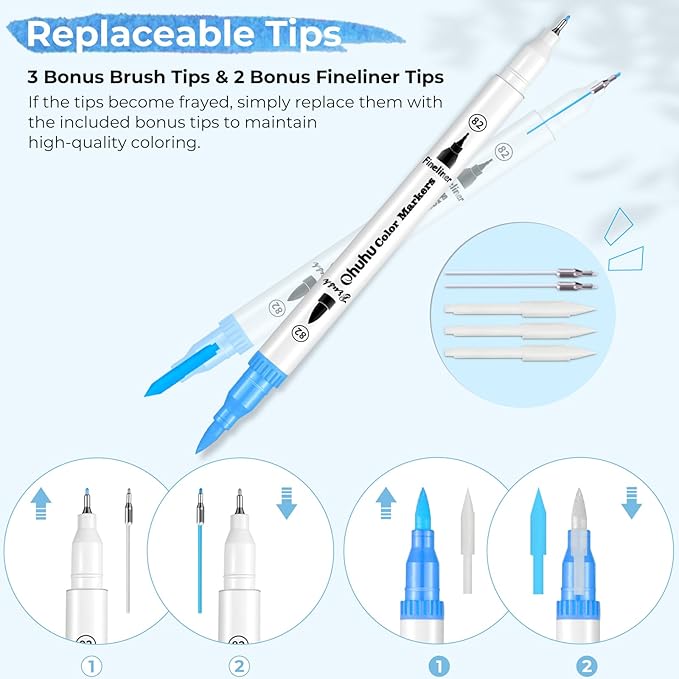 - INCLUDES 5 REPLACEMENT TIPS: Each package comes with 3 replacement brush nibs, 2 fine tips, and a pre-printed numbered color swatch card for your convenience. Ohuhu colored markers set make a perfect gift for birthdays, Christmas, Valentine’s Day, back to school, or any occasion!