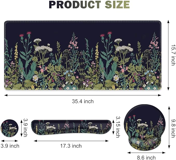 - 【Extended Mouse Pad & Wrist Rest Set Size】Large Desk mats on top of desks 35.4 x 15.7 inch, Wrist pad for keyboard 17.32 x 3.15 inch, Mouse pad with wrist support 9.8 x 8.6 inch, Cup coaster 3.9 inch. The large mouse pad for desk can fit wireless mice, full keyboard, laptop and computer