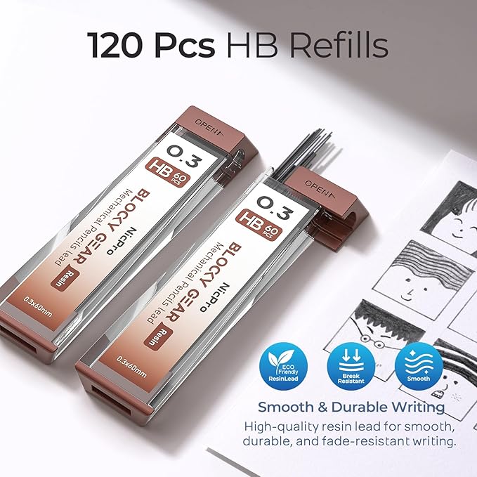- Nicpro Blocky Gear:Come with a metal 0.3mm mechanical pencil and 2 tube of 0.3 mm HB lead refills,60pcs / tube,1pcs 4B latex-free eraser,9pcs replaceable cap erasers,all the stuff storage neatly in a case with flocking tray,what a gift for friends & family!