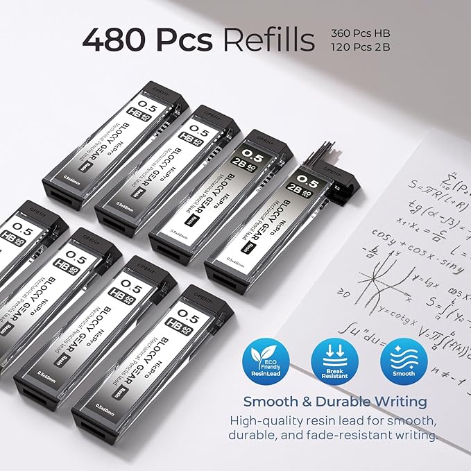 - Nicpro Blocky Gear:Come with 3PCS metal 0.5mm mechanical pencil and 8 tube of 0.5 mm lead refills (6 tube of HB and 2 tube of 2B), 60pcs / tube, 3pcs 4B latex-free eraser, 18pcs replaceable cap erasers,1 pcs kneaded eraser, all the stuff storage neatly in a case with flocking tray,what a gift for friends & family!Ideals for artists, professionals, teachers and students alike