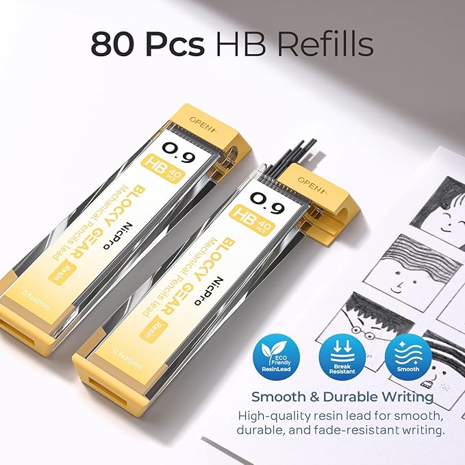 - Nicpro Blocky Gear:Come with a metal 0.9 mm mechanical pencil and 2 tube of 0.9 mm HB lead refills,40pcs / tube,1pcs 4B latex-free eraser,9pcs replaceable cap erasers,all the stuff storage neatly in a case with flocking tray,what a gift for friends & family!
