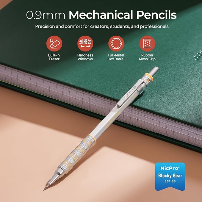 Nicpro Blocky Gear 0.9 mm Mechanical Pencils Set in Case, Metal Pencil with 0.9mm HB Lead Refills, Eraser for Professional & Adult Art Writing Drafting Drawing