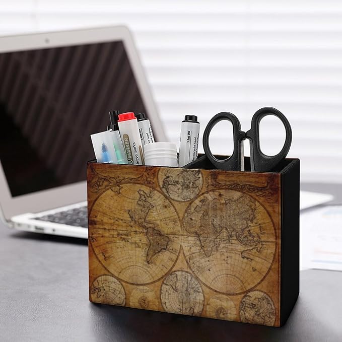 Pen Holder, Pencil Holder for Desk Organizer, Vintage Retro World Map PU Leather Pencil Cups Desktop Stationery Storage Makeup Brush Holder Pen Organizer for Office Home