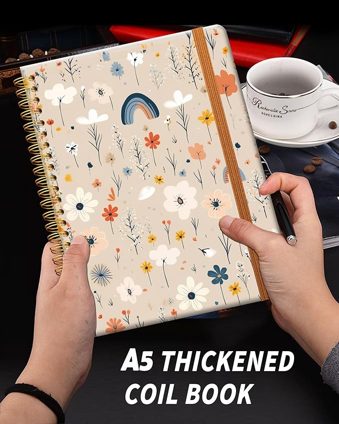 Ruled Spiral Writing Notebook,A5 Hardcover Lined College Journal for Women Lady Girl,Strong Twin-Wire Binding with Premium Paper,8.4" X 6",Perfect for School,Office,Home Gifts(rainbow flower