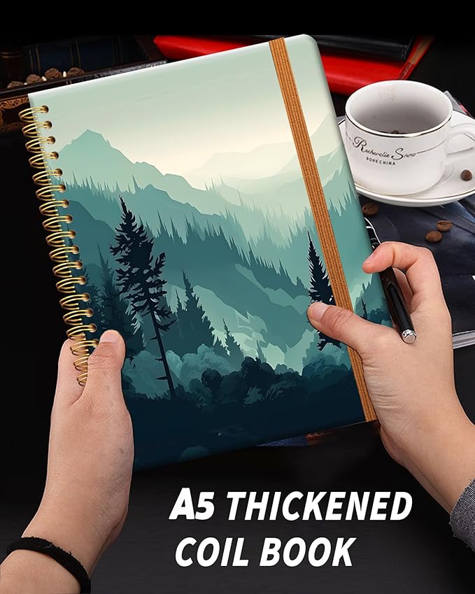 Ruled Spiral Writing Notebook,A5 Hardcover Lined College Journal for Women Lady Girl,Strong Twin-Wire Binding with Premium Paper,8.4" X 6",Perfect for School,Office,Home Gifts(green mountain forest)