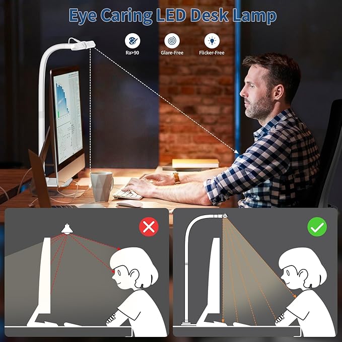 - 1200lm Eye-Caring Task Lamp: Featuring 45-degree angle directionally illuminatination,the right Office Desk Lamp has ability of casting and extending the light to working area without disturbingly hitting your eyes. CRI>90 makes the color more vivid and accurate, creating True-To-Life and comfortable light. No Glare, No Flickering, No shadow, effectively reduces eye fatigue caused by prolonged exposure to light.Feel free to contact customer service with any questions or concerns