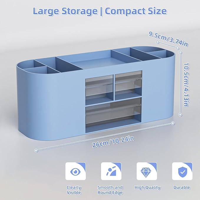 Marbrasse Desk Organizer Pen Holder for Desk with 3 Drawers, Multi-Functional Pencil Holder, Desk Organizers and Accessories with 7 Compartments for Home, School, Classroom(Blue)