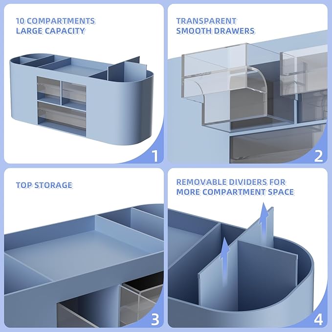 - 【ALL IN ONE OFFICE DESK ORGANIZER】: This desk organizer has three transparent drawers and seven compartments, providing enough space to store all your desk accessories, such as scissors, paper clips, sticky notes, pencils, pens, highlighters, and all other office supplies. It's a super desk organizers and accessories that can even be used as a makeup brush holder, kitchen storage box, and more.