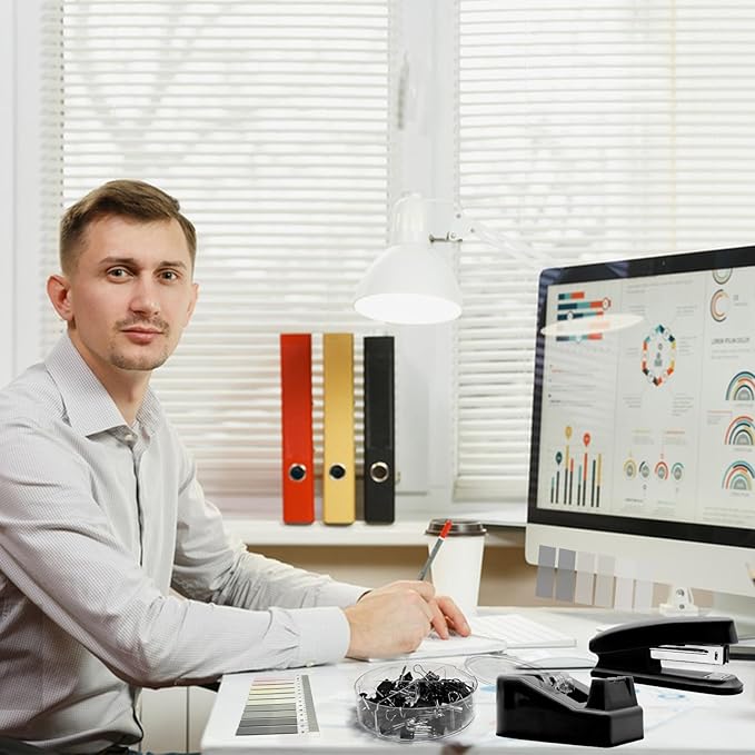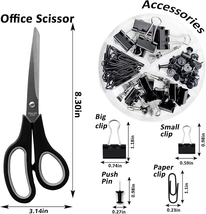 - 【Package Includes】 This black office supplies contains 1x Black Stapler, 1x Black Staple Remover, 1000x Staples, 1x Black Tape Dispenser, 1x Office Scissor, 20 x Push pins 7 x Big Clips 15 x Small Clips 30 x Paper Clips, 10 Colors Tabs.
