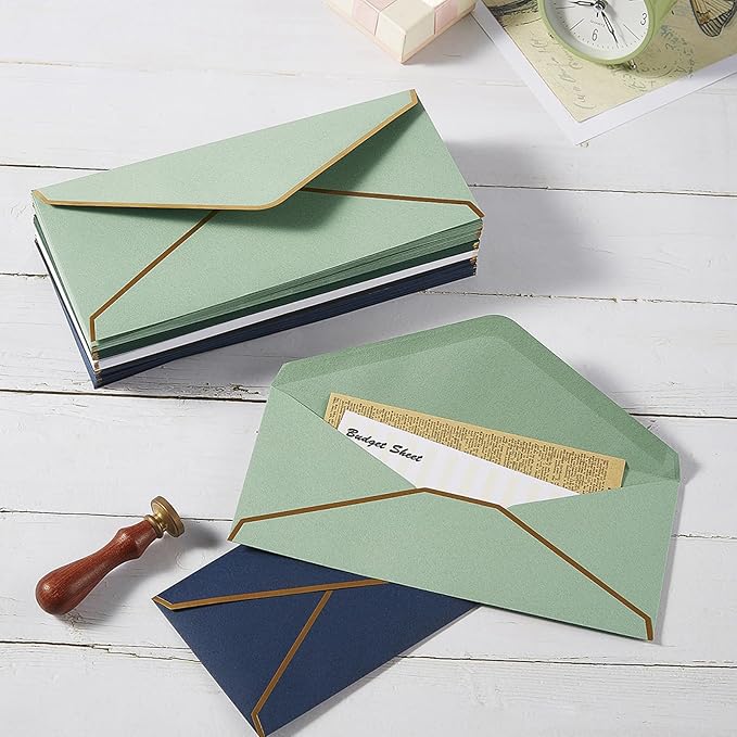 - Package: 100 pieces sage-green #10 Envelopes and 100 pieces gold stickers;