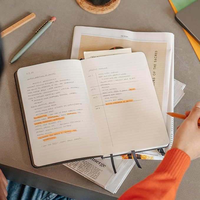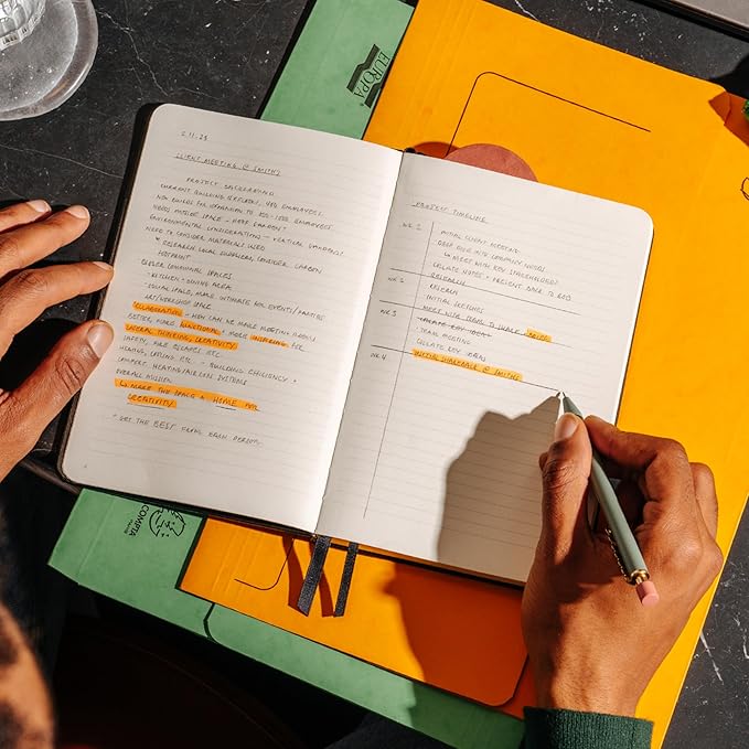 - Dreamy Details: If you fantasise about high GSM & the number of pages in quality notebooks, here’s what you need to know: 192 pages of FSC lined paper, 0.6cm line height, 100gsm inside pages (that’s code for nice & thick) & a soft touch cover. There’s also a handy expandable pocket to help you hold onto important papers & a double ribbon.