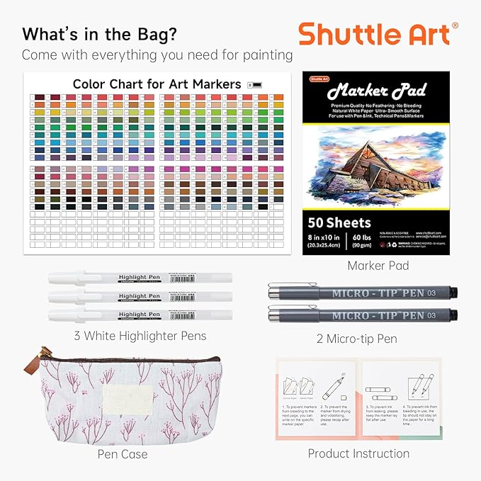 - BONUS ACCESSORIES: Bonus 2 micro-tip pens 3 white highlighter pens 1 marker pad 1 color chart 1 storage case with holders and product instruction. White highlighter pens for manga highlighting and micro-tip pens for detailed lining. The marker pad has a smooth surface that can prevent bleeding and smudging for your artwork. Black zipper case with holders is perfect for organized storage. Color charts can record your color collection all in one place. More accessories with cheaper price!