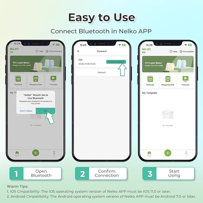 - Easy to Use: NELKO label printer compatible with IOS & Android Phone via bluetooth connection. Step 1: Download "Nelko" APP from Google Play or App Store. Step 2: Install the paper roll. Step 3: Connect the P21 bluetooth within APP. Step 4: Choose a quick template and start printing. It is not compatible with Google phones on Android 14. This label maker machine with tape APP included more than 90 +Fonts, 10+ Languages, 450+ Materials. (Note: This label maker doesn't work with computers)