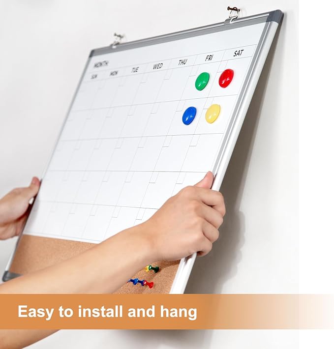 Comix Dry Erase Calendar Whiteboard Corkboard Combo, 24 * 18 inch Monthly Calendar and Bulletin Board Combination for Wall, Aluminum Frame Planner with Dry Erase Markers, Magnets, Push Pins
