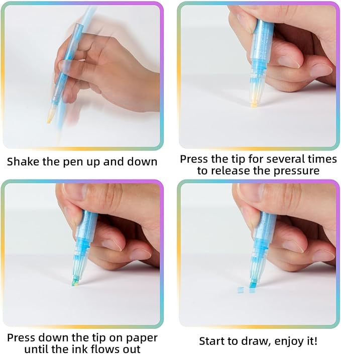 - PRESS INK-OUT TIP: The high quality nylon chisel tip is designed as a press ink-out style. It can control the amount of ink coming out and prevent the ink from drying out. Shaking the pen with the cap on it to mix the ink before using, then take off the cap and press the tip on the paper for several times until the ink comes out. To extend the service life, please remember to recap the markers and place them horizontally after use.