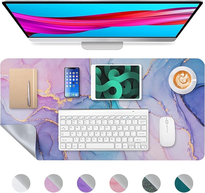 - Durable Non-Slip Material - Constructed from dense 2mm thick PU leather, this large mouse mat firmly grips the desktop to ensure stable operation of your mouse and keyboard. It's specially designed for use on both sides, featuring a beautiful alcohol ink print on the front and a solid silver color on the back, creating a 2-in-1 desk pad.