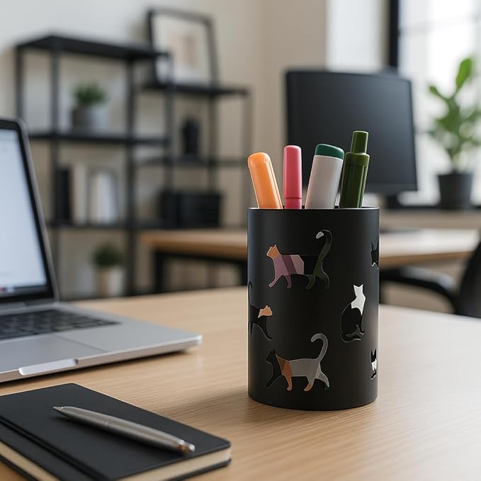 Mango Steam Metal Pen Holder, Makeup Brush Cup Organizer for Office, Bathroom, Vanity (Black, Cat)