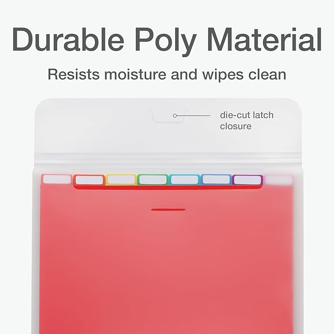 - Durable poly file pockets open from the top and side for easy access and tear & moisture-resistant protection; folders come in glossy red, orange, yellow, green, sky blue, dark blue, purple and lilac