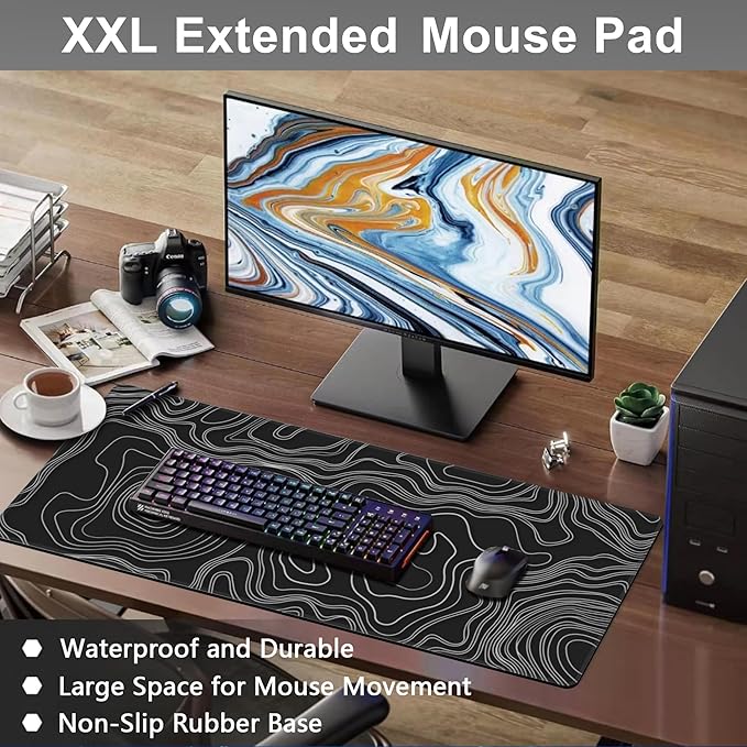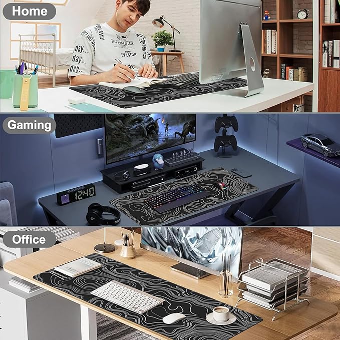 Mouse Pad, Large Mountain Topographic Terrain Map Desk Mat, Extended Non-Slip Gaming Keyboard Mousepad Desk Pad, Thick Stitched Edges Waterproof Mouse Mat 31.5"x15.7" (White Topographic Line Art)