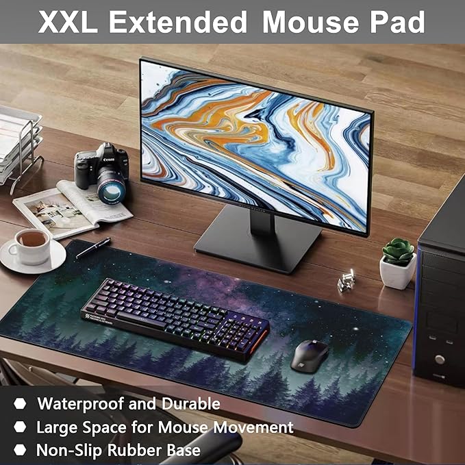 Mouse Pad, Large Galaxy Space Forest Desk Mat, Extended Non-Slip Gaming Keyboard Mousepad Desk Pad, Thick Stitched Edges Waterproof Mouse Mat 31.5"x15.7" (Night Sky Forest)