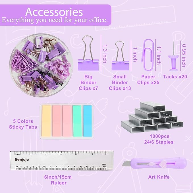 - 【YOU WILL GET】- This purple desk accessories set contains almost all the essential office supplies, including a stapler, a stapler remover, a tape dispenser, a scissor, a ruler, an art knife, 1000 staples, 5 colors of sticky pages, 25 paper clips, 20 binder clips, 20 tacks. For all your daily office needs.