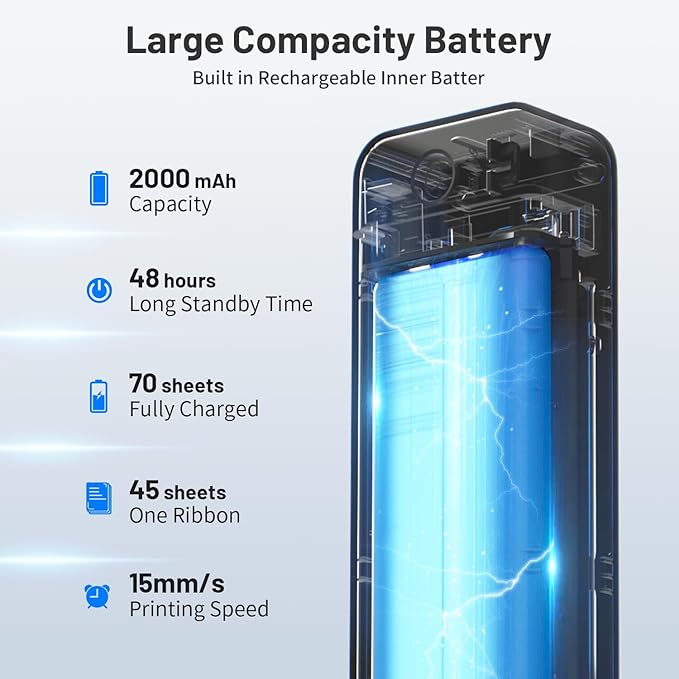 - 【Compact and Space-saving】The P831 wireless bluetooth printer measures the size of two mobile phones. It can easily fit into your bag or briefcase, making it convenient to transport. Whether you're traveling for work, business, in the office, at home, in the car, or at university, this travel printer is an excellent choice for on-site printing from anywhere.