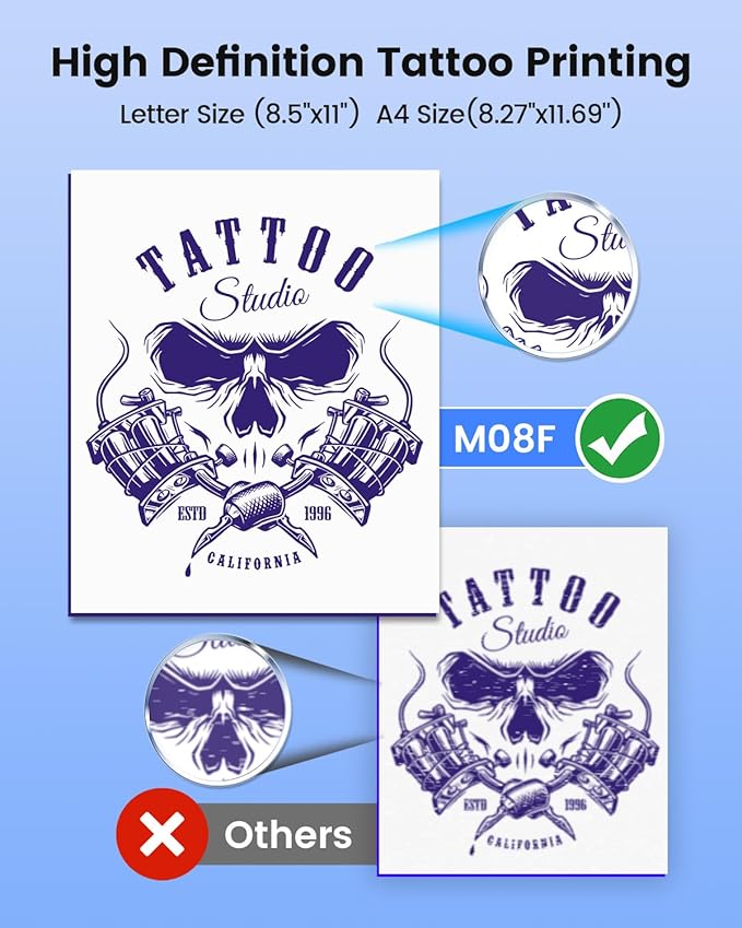 - Exceptional Print Quality: Phomemo bluetooth tattoo stencil printer delivers crisp, dark, and sharp images with smooth printing effects. Experience hassle-free printing with high-quality black and white results every time.(M08F printer cannot print color)
