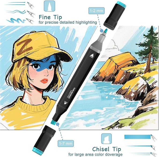 - 【DUAL TIP & HIGH CAPACITY】Alcohol markers has broad chisel tip (approximately 1-7mm) and fine tip (approximately 1-2mm) for precise highlighting and underlining, made of wear-resistant material. Using the fine tip for sweeping, calligraphic strokes or quickly color in large areas with the chisel tip, seamless mixed coloring, to meet all your drawing needs.