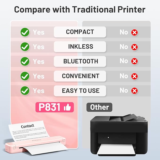 - 【Compact and Space-saving】The P831 wireless bluetooth printer measures the size of two mobile phones. It can easily fit into your bag or briefcase, making it convenient to transport. Whether you're traveling for work, business, in the office, at home, in the car, or at university, this travel printer is an excellent choice for on-site printing from anywhere.