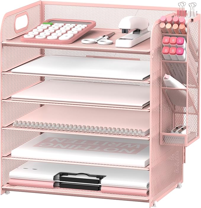 SUPEASY 6 Tier Desk Organizer with 4 Pen Holders, Mesh Paper Organizer Letter Tray with Handle, Desk Organizer Tray File Organizer for A4 File Folder, Rose Pink