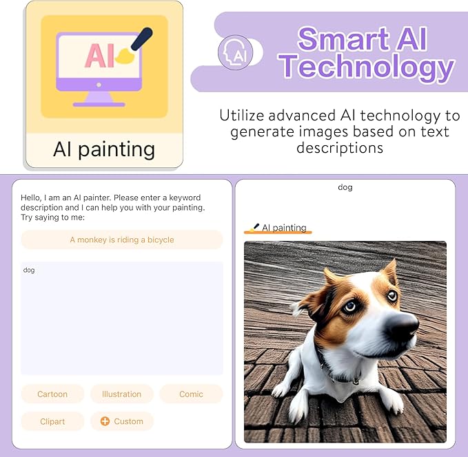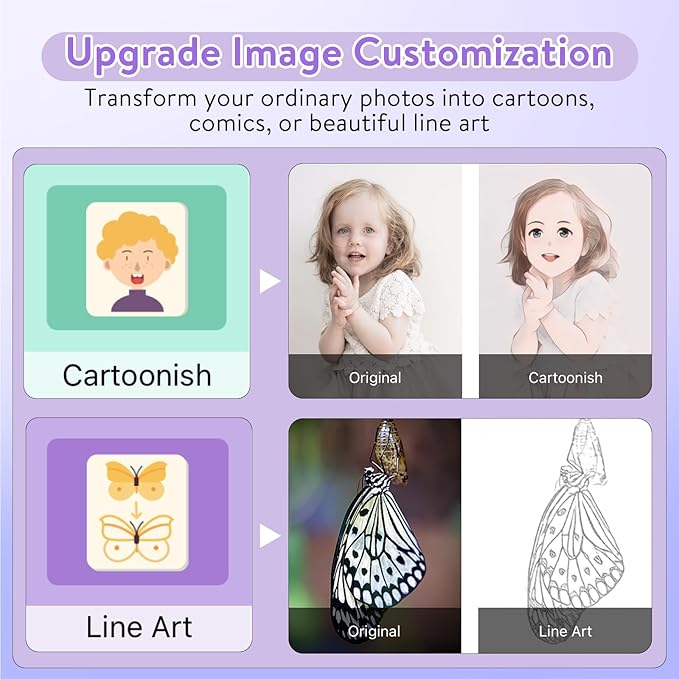 - AI Intelligent Printing: Newly upgraded AI function, AI intelligent generation of images, AI photo conversion into cartoons, line art, etc. Enter the text description of the desired image and generate the desired image for printing. You can also convert portrait photos into cartoons through AI intelligent conversion for more fun printing