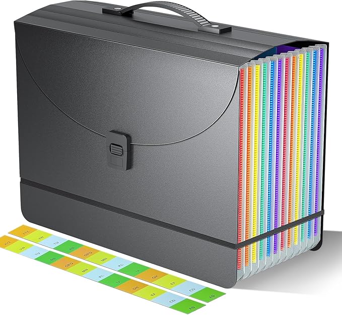 - 【Extra Large Storage Capacity】: Standing without closing the lid, the accordian file organizer holds up to 1500 sheets of paper, and it provides 25 individual pockets for reliable partitioning. The pockets are tabbed to allow for adding handwritten labels, ensuring each section can be instantly identified for quick access. Each pocket offers a generous amount of space, expanding to 1 1/8 inches. From homework assignments to presentation documents or household records and receipts, the expandable file folder has you covered