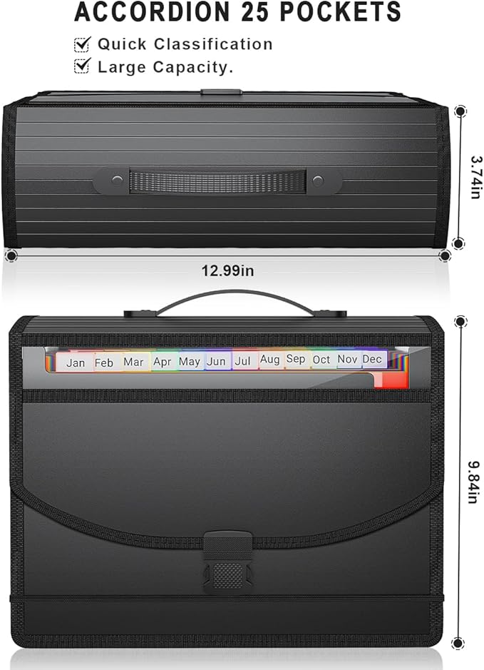 - 【Super Portable and Secure Closure】: Compared with other bottom expandable accordion folders, a handle is added, which makes it very easy to move. Other file folders with a plastic handle usually cannot expand at the bottom, which greatly limits its usable capacity. Our folder does not have this trouble. It is easy to move and has enough capacity.ABS Buckle and elastic band provide perfect secure closure.