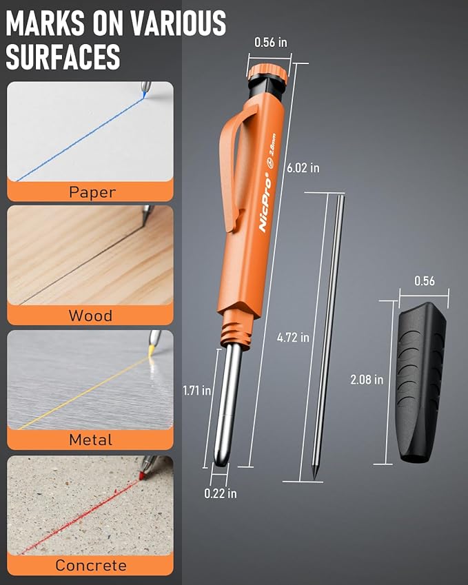 - Deep Hole Marker Pencil With Sharpener: The deep-hole construction pencils adopts 45mm elongated tip design, which is more convenient to mark in the small hole or in other tight areas. In addition this, the woodworking pencils come with a built in sharpener screwed into the top of each work pencil for providing nice precision at all times