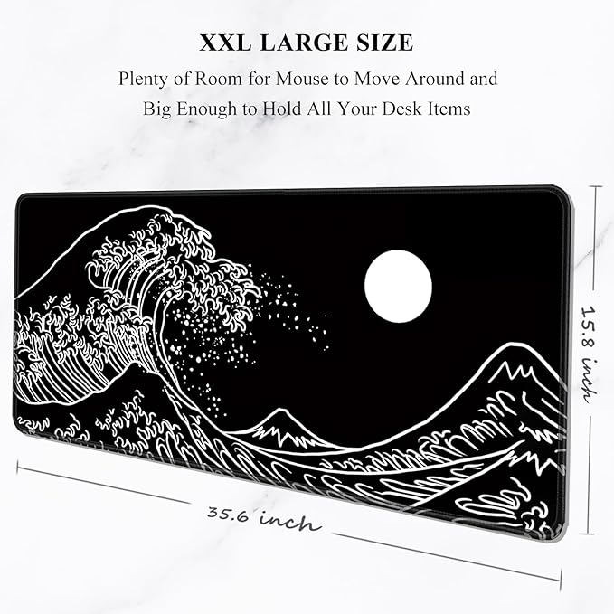 Auhoahsil Large Mouse Pad, XXL Gaming Mousepad, Desk Mat for Desktop, Thick Rubber, Big & Long Size, Stitched Edges, Full Desk Pad for Laptop & Computer, Extended 35.4 x 15.7 in, Black Great Wave